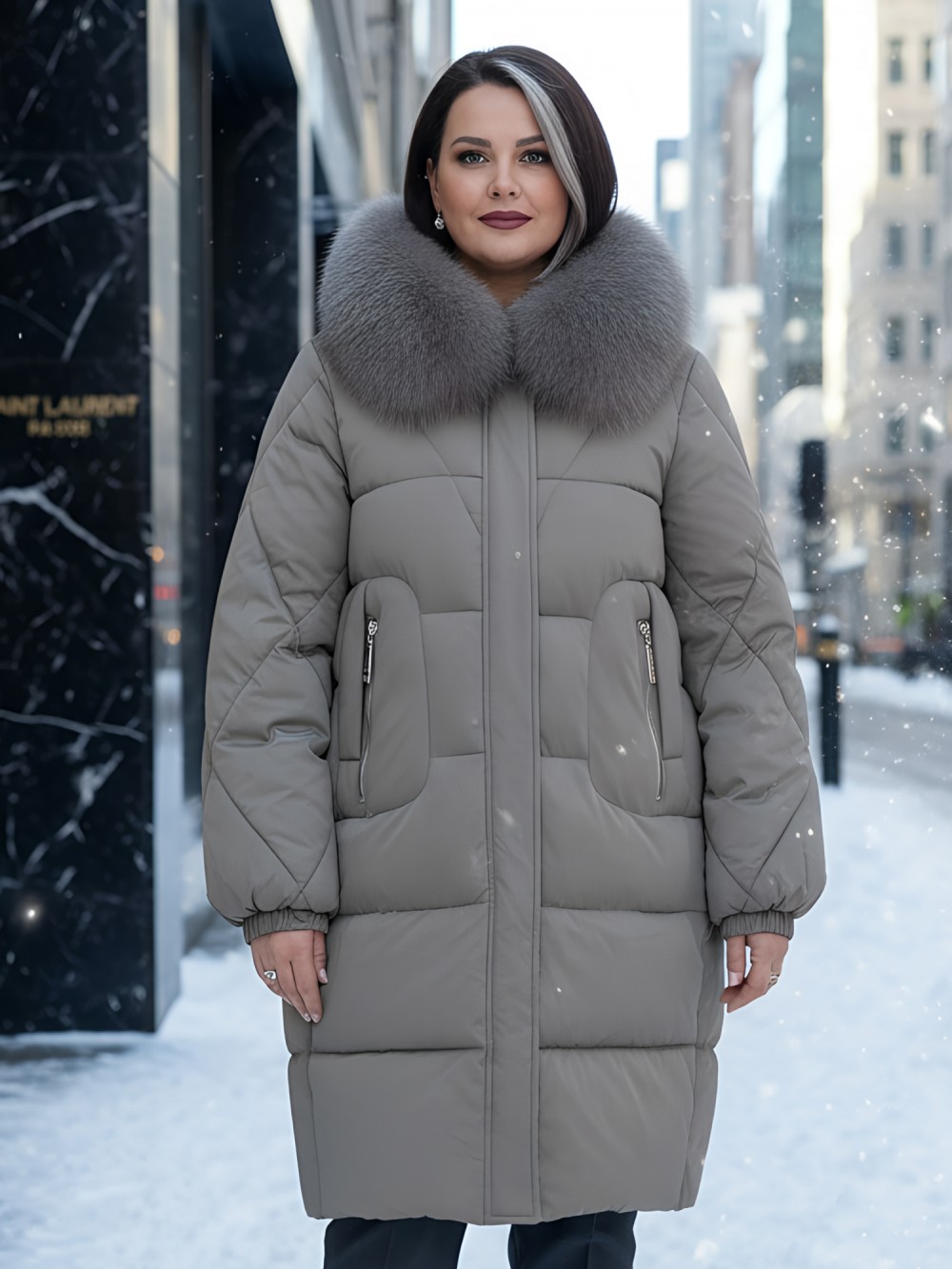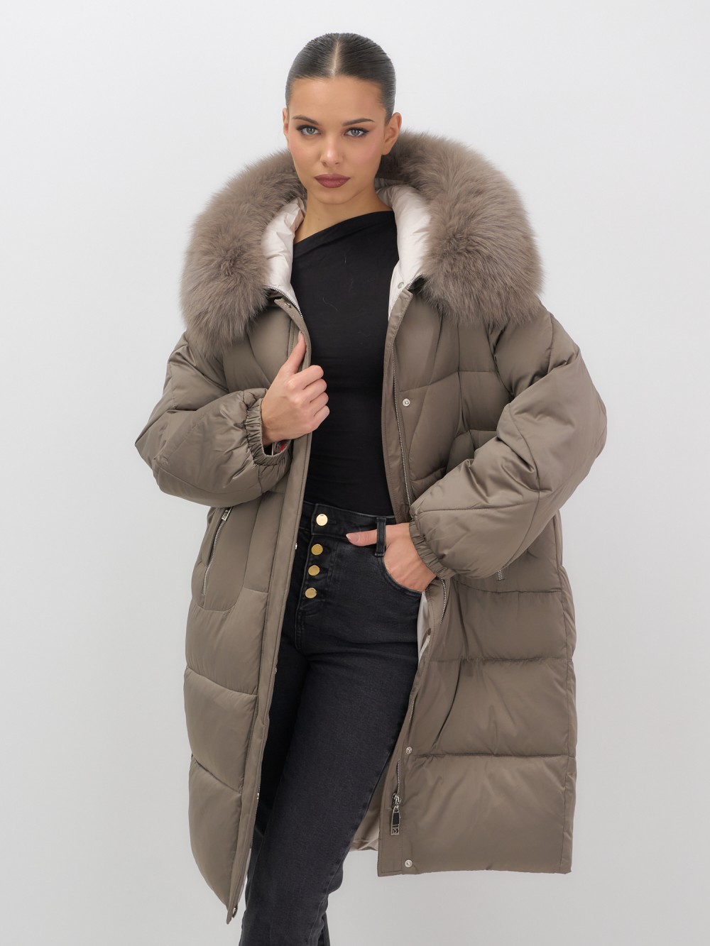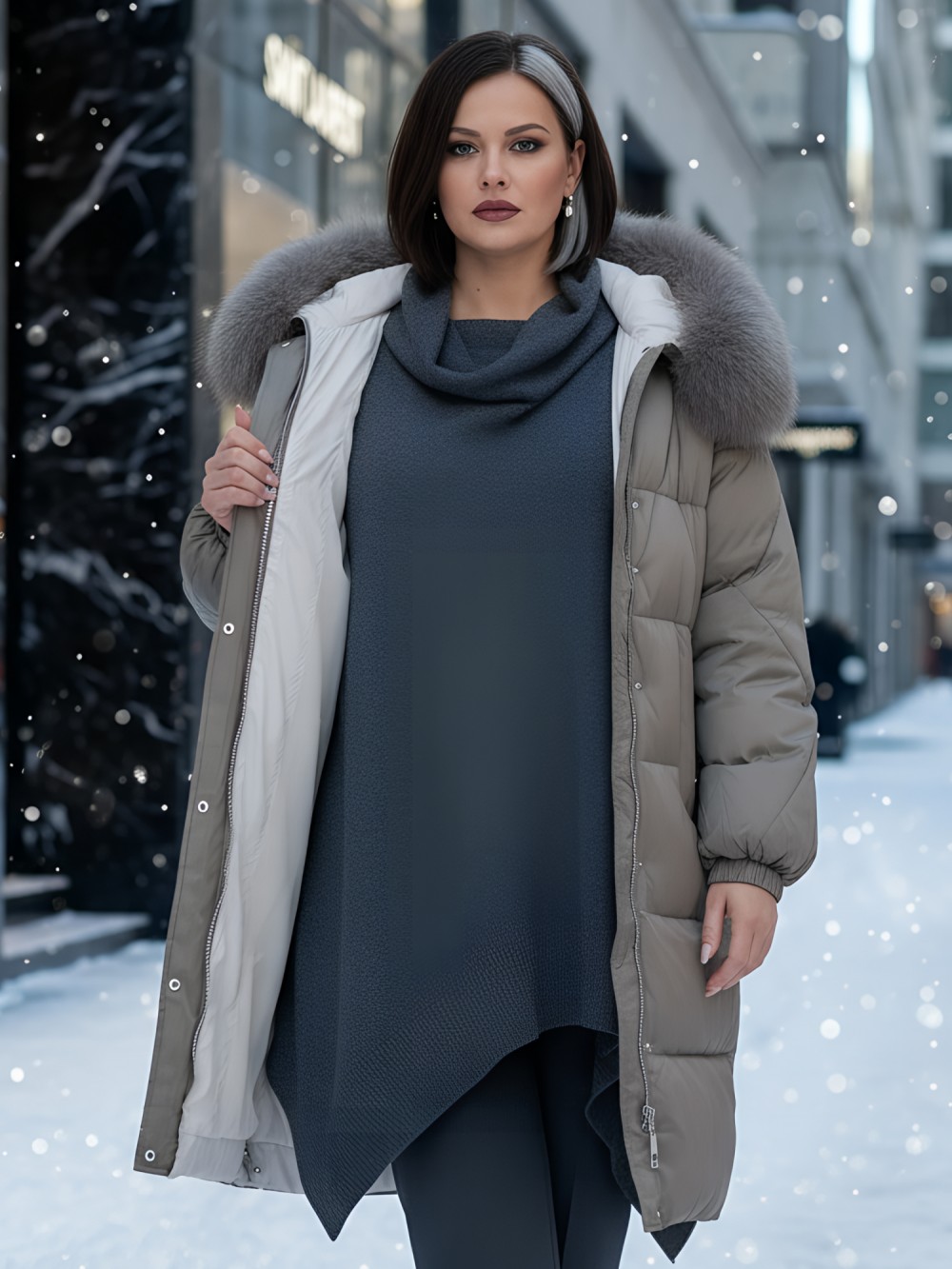 Четыре благородных оттенка коллекции осень-зима 2025 – глубокий черный, роскошный коричневый, изысканный светло-коричневый и стильный горчичный – великолепно сочетаются с натуральным мехом песца. Удлиненный силуэт до колена и свободный крой идеальны для размеров 46-54.