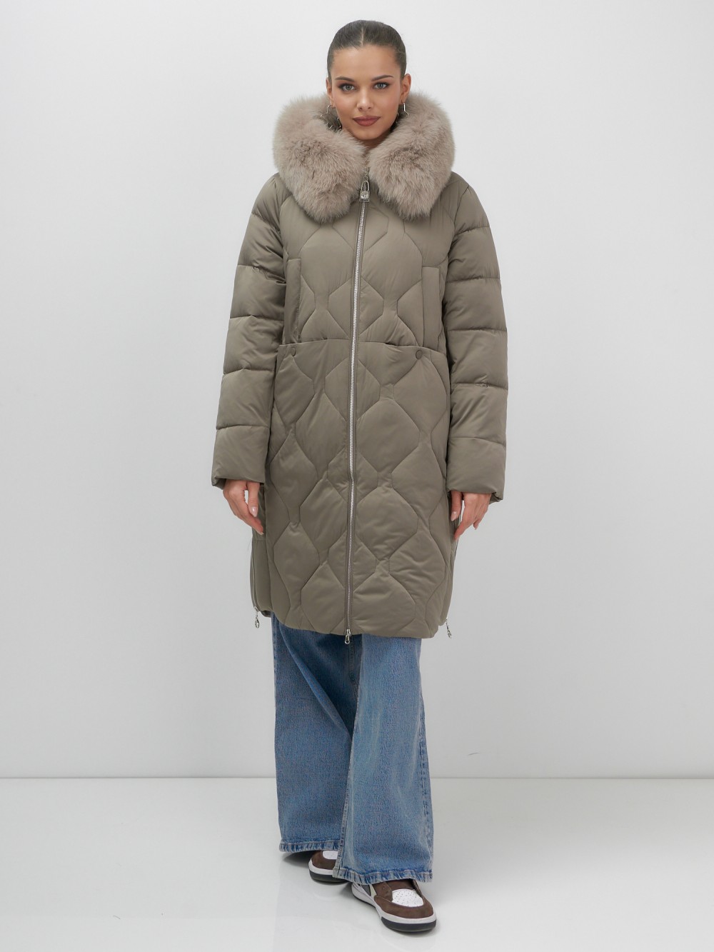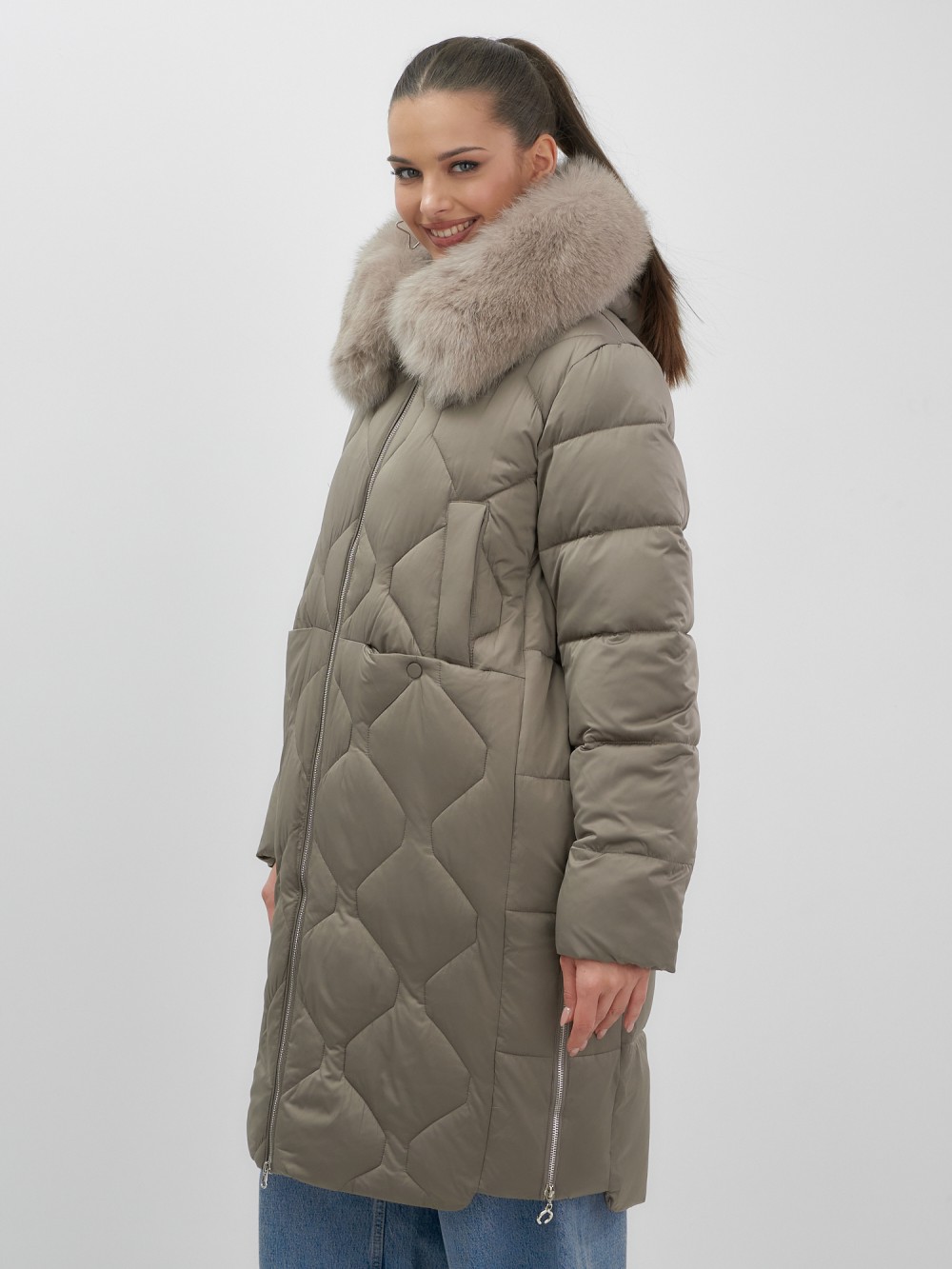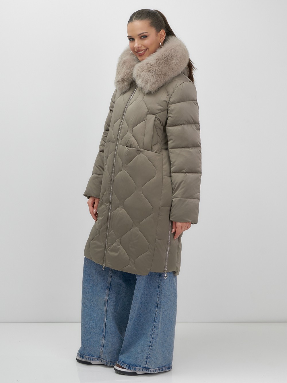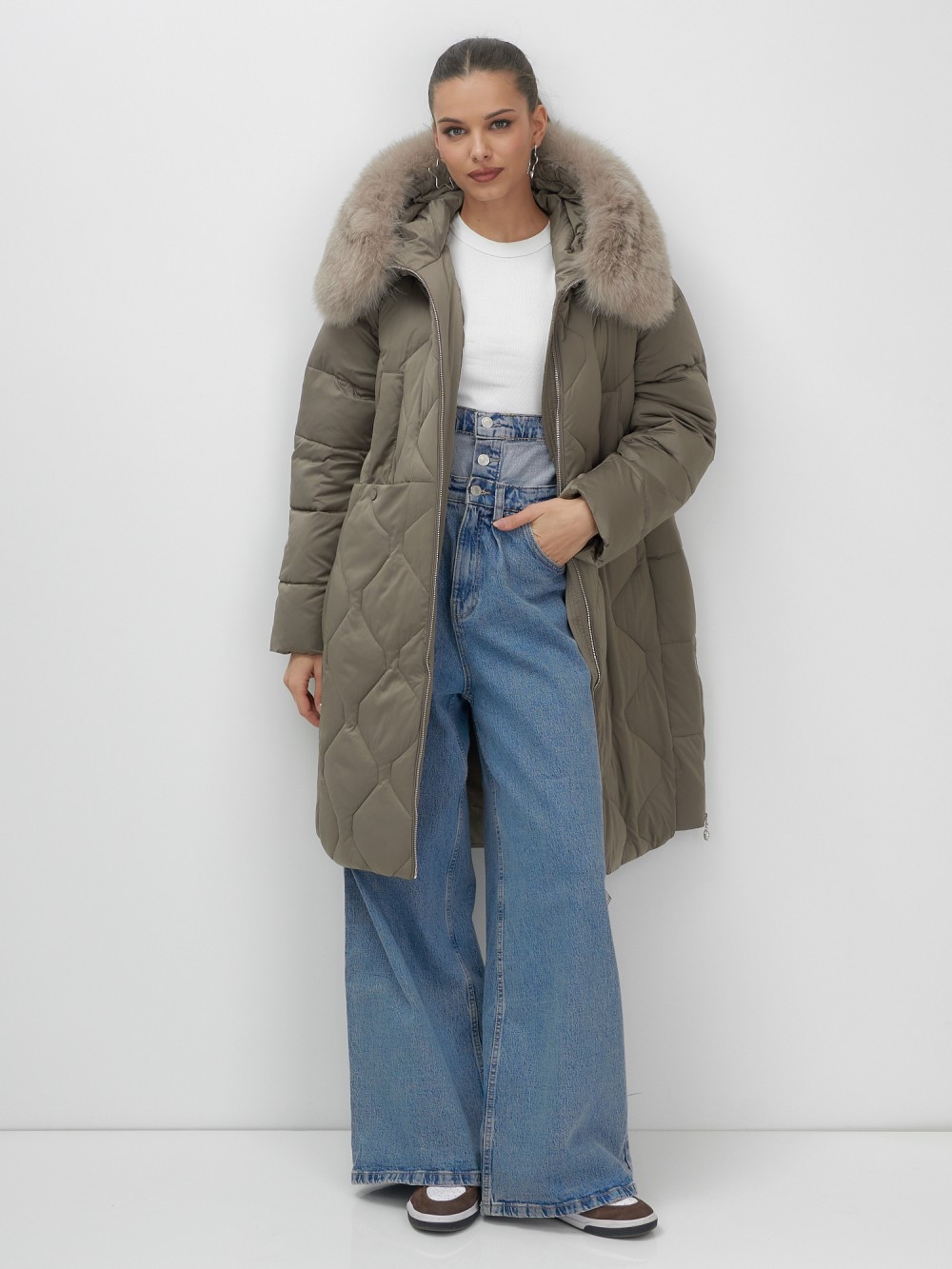 Пять благородных оттенков коллекции осень-зима 2025 – глубокий черный, роскошный коричневый, изысканный светло-коричневый, элегантный темно-коричневый и благородный темно-зеленый – великолепно сочетаются с натуральным мехом песца. Удлиненный силуэт до колена и свободный крой идеальны для размеров 48-56.