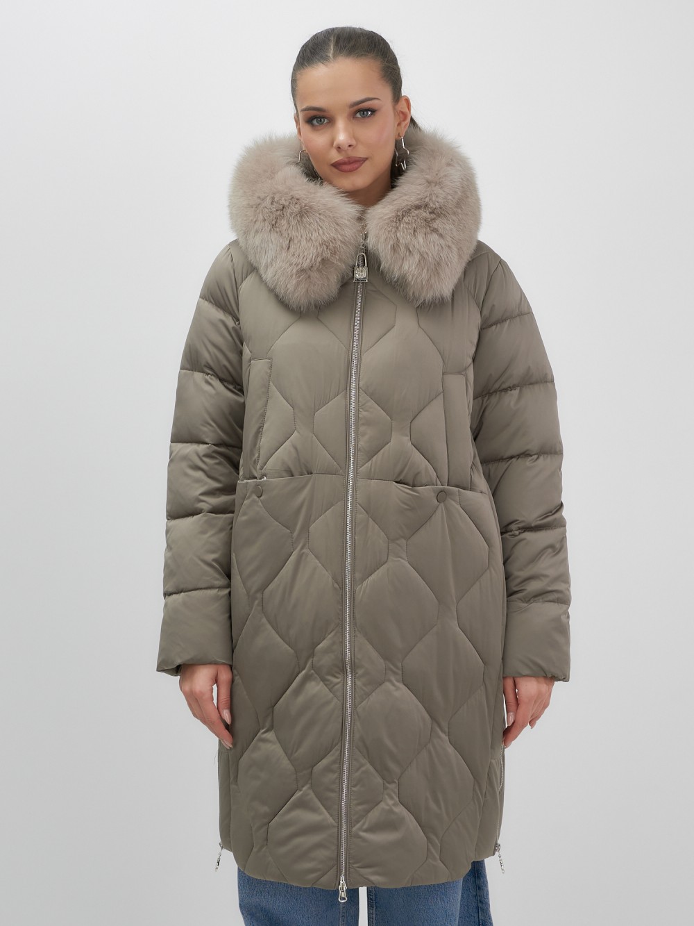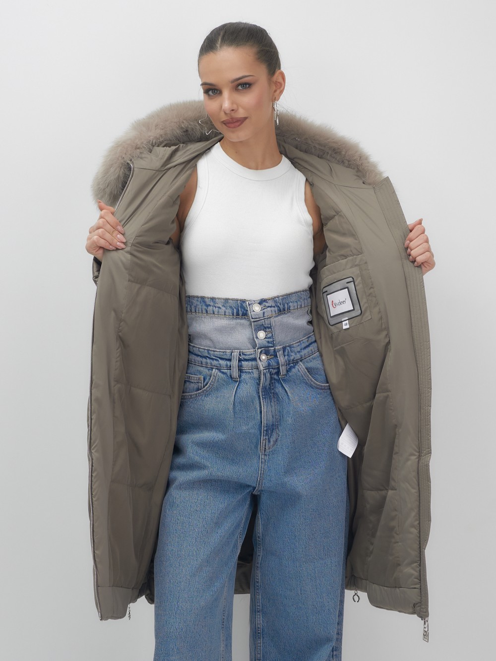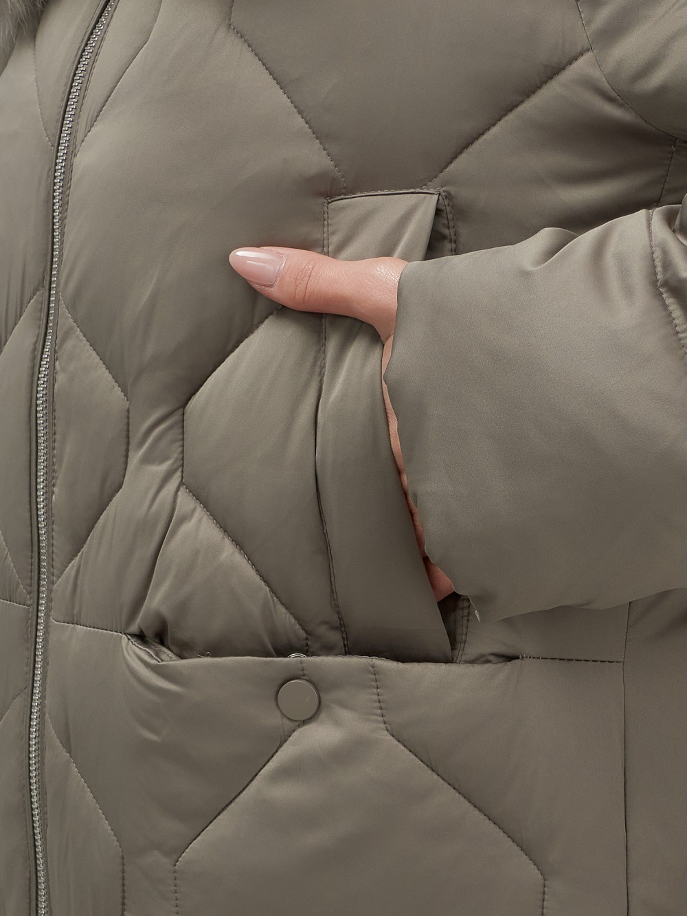 Пять благородных оттенков коллекции осень-зима 2025 – глубокий черный, роскошный коричневый, изысканный светло-коричневый, элегантный темно-коричневый и благородный темно-зеленый – великолепно сочетаются с натуральным мехом песца. Удлиненный силуэт до колена и свободный крой идеальны для размеров 48-56.