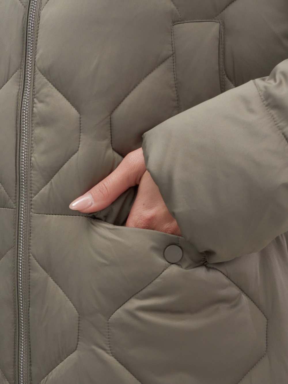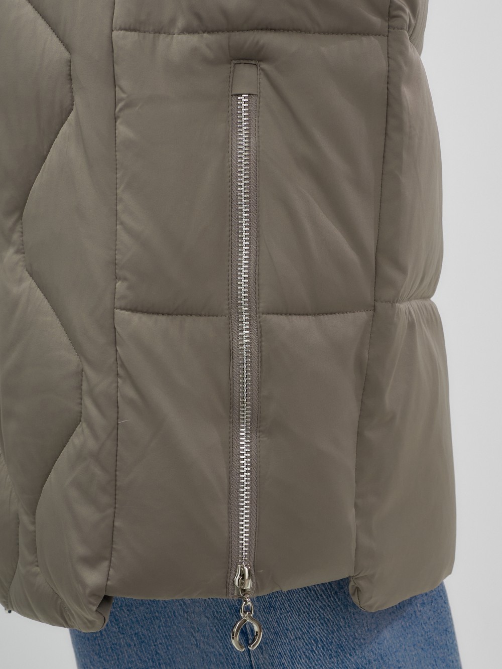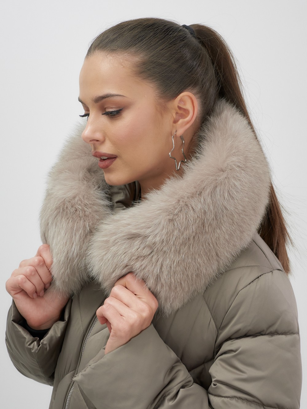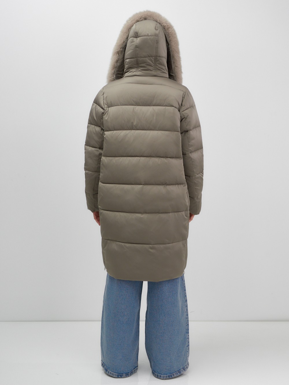 Пять благородных оттенков коллекции осень-зима 2025 – глубокий черный, роскошный коричневый, изысканный светло-коричневый, элегантный темно-коричневый и благородный темно-зеленый – великолепно сочетаются с натуральным мехом песца. Удлиненный силуэт до колена и свободный крой идеальны для размеров 48-56.