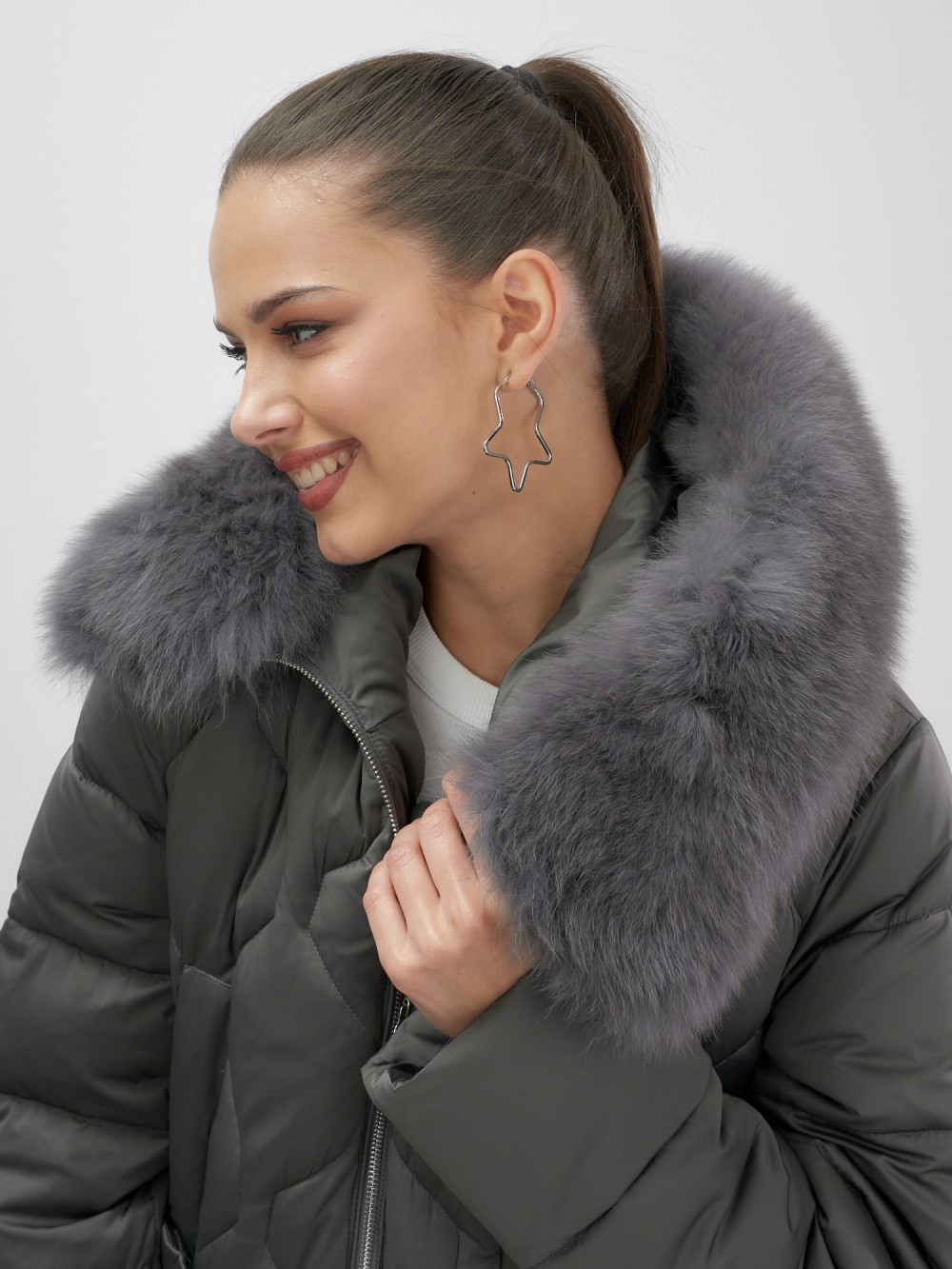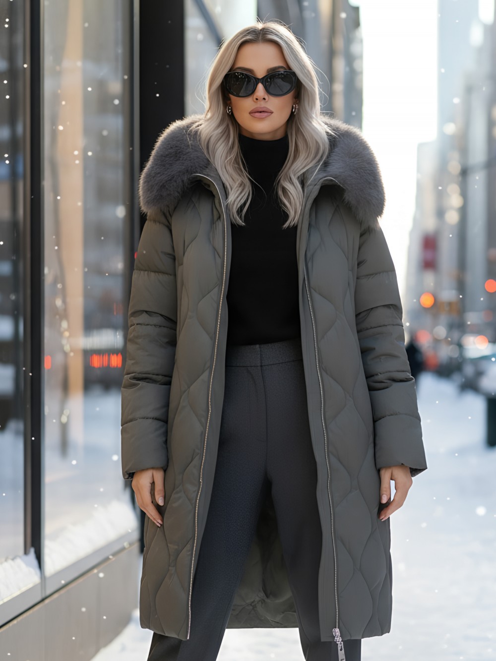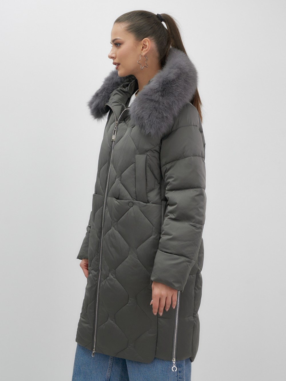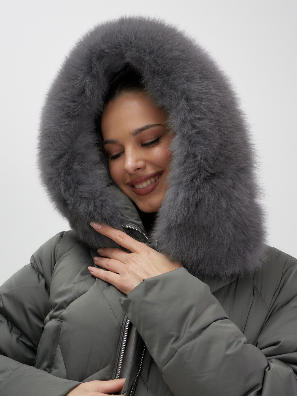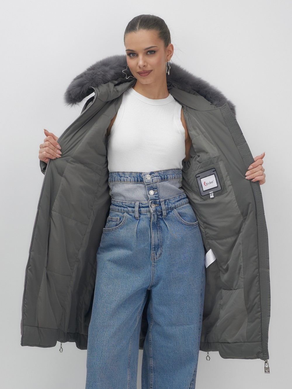 Пять благородных оттенков коллекции осень-зима 2025 – глубокий черный, роскошный коричневый, изысканный светло-коричневый, элегантный темно-коричневый и благородный темно-зеленый – великолепно сочетаются с натуральным мехом песца. Удлиненный силуэт до колена и свободный крой идеальны для размеров 48-56.