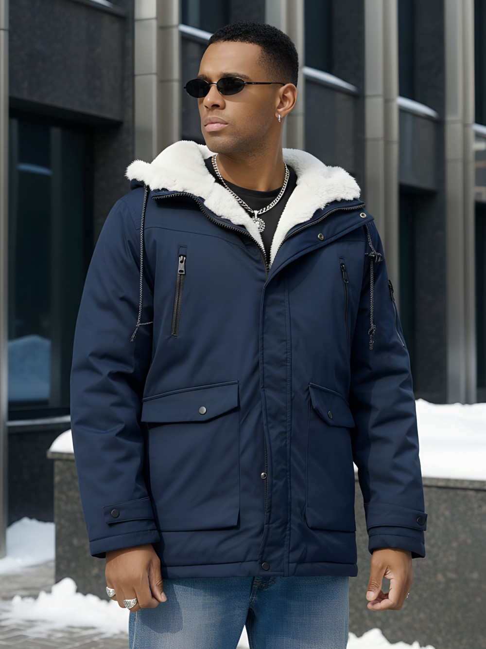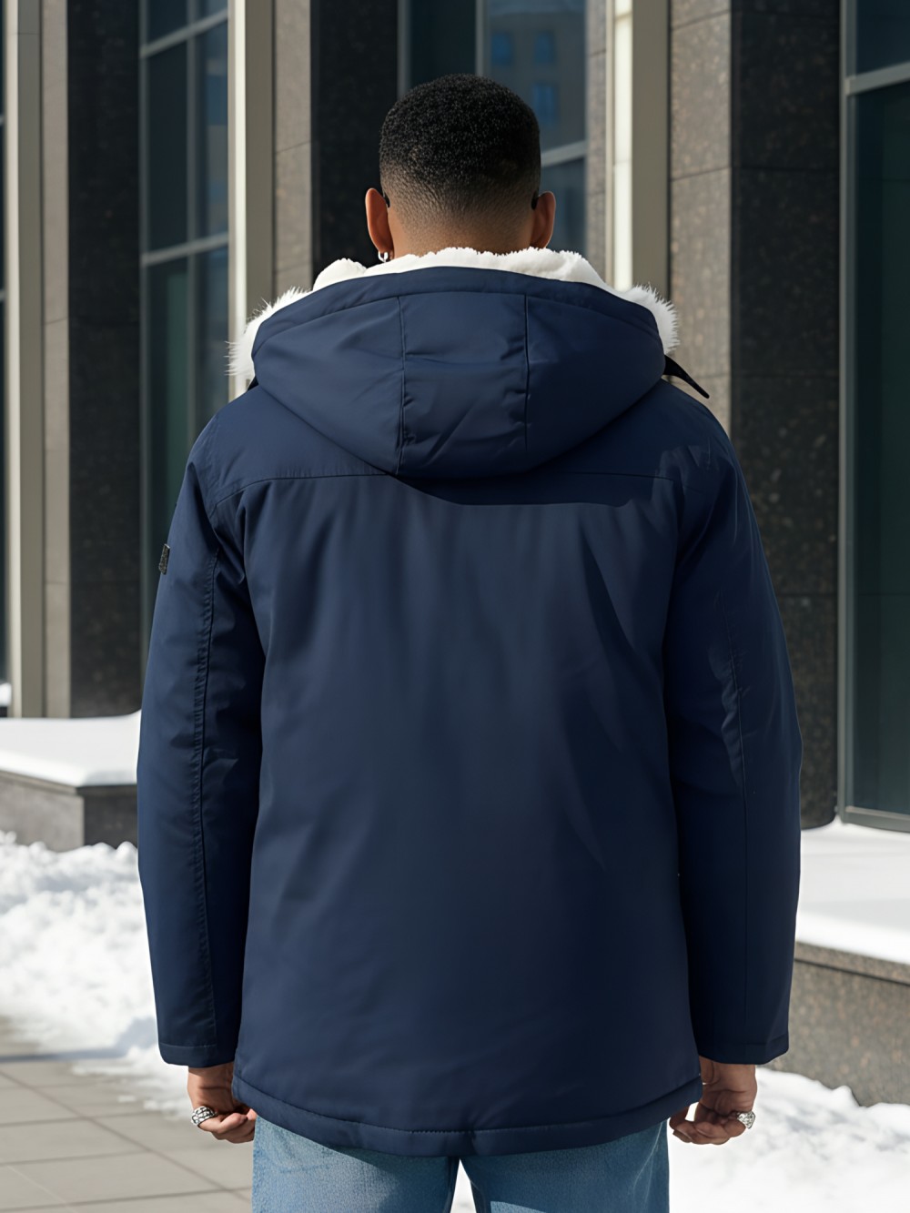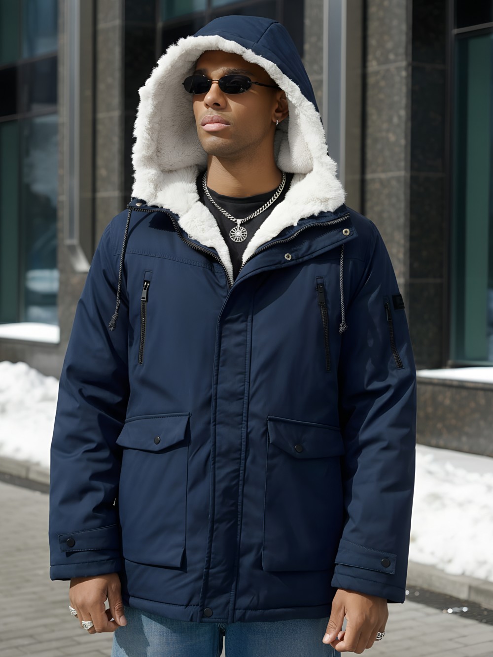 - Несъемный капюшон с меховой подкладкой: Обеспечивает максимальную защиту от холода и ветра, а мягкий искусственный мех добавляет уюта.