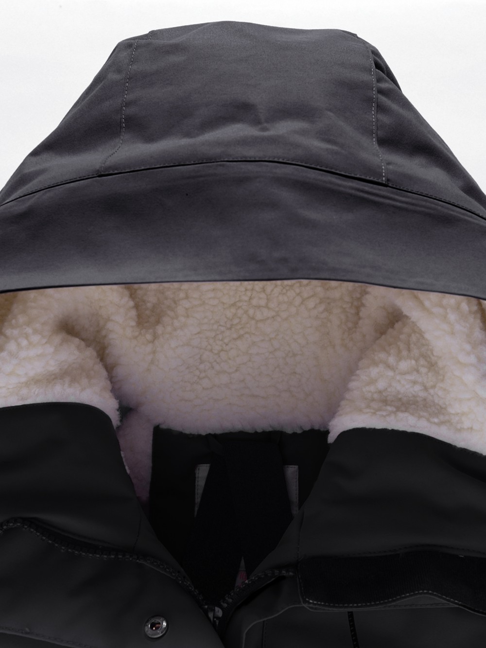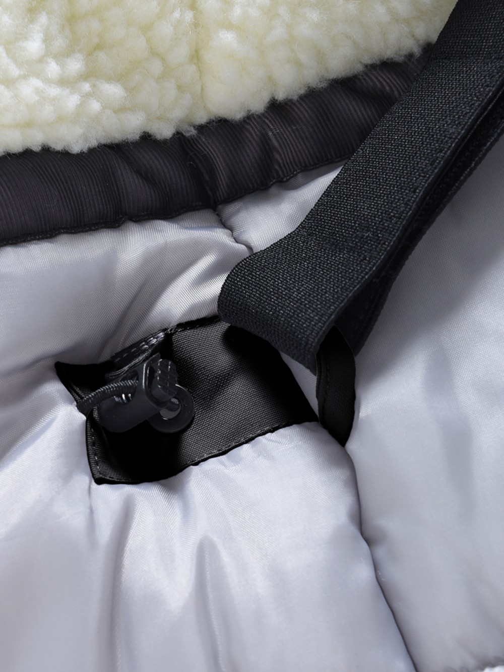 фиксаторы по низу, на капюшоне и по центру (в области талии) позволяют настроить силуэт — сделать его более приталенным или оставить прямым;