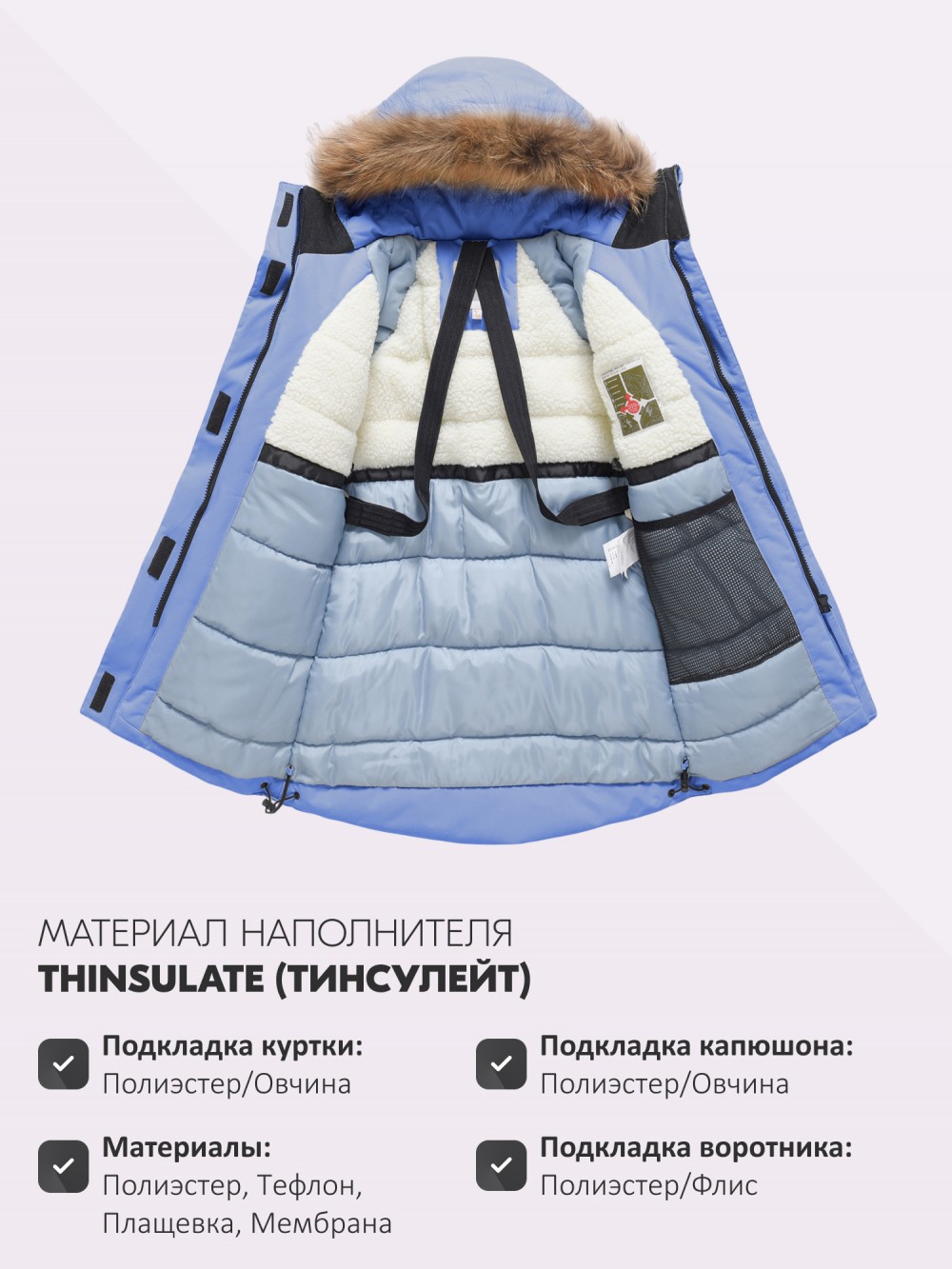 водоотталкивающий материал, гипоаллергенный материал, дышащий материал, с начесом, светоотражающие детали, утягивающая модель