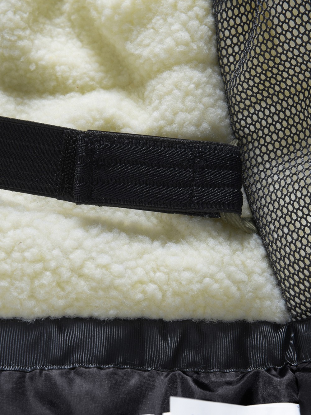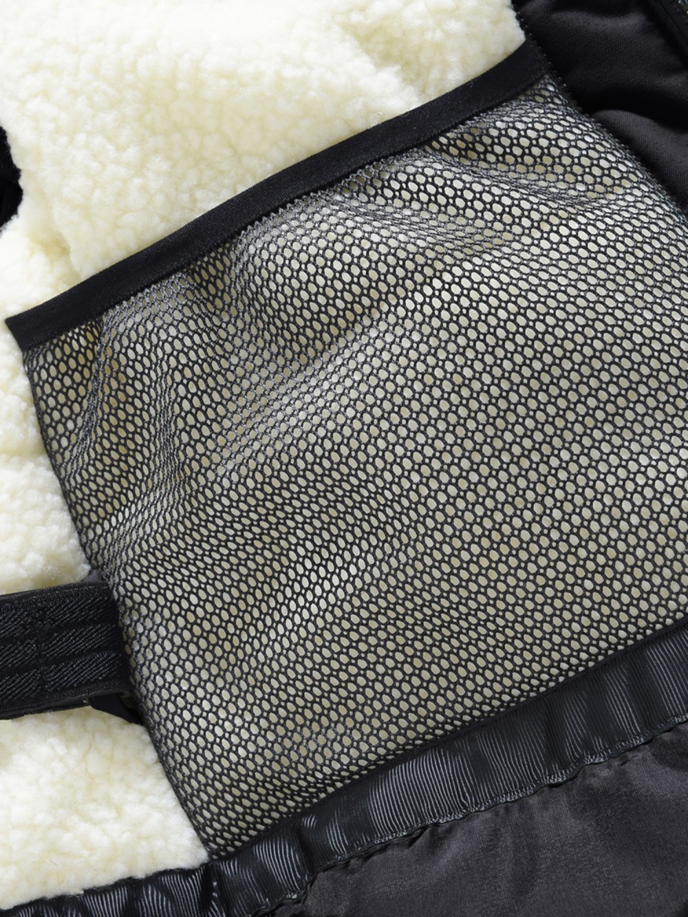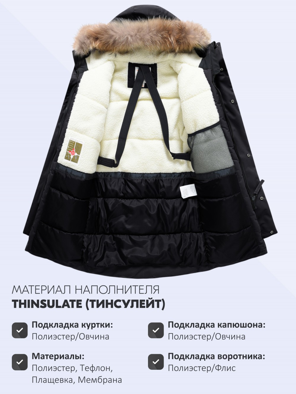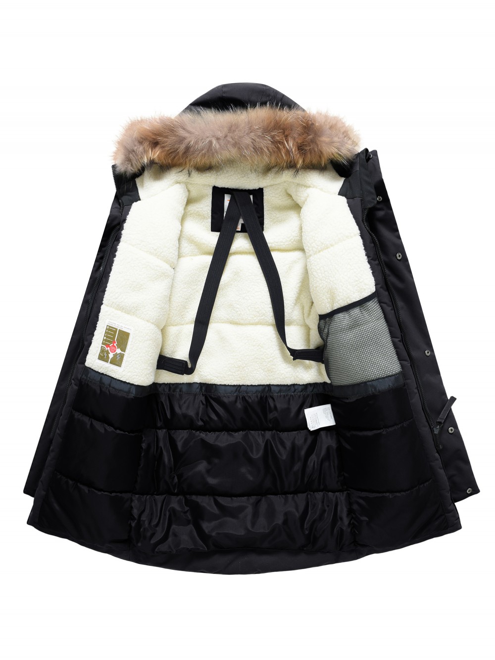 Внутренняя подкладка из овчины, полиэстера и флиса делает парку особенно уютной и приятной к телу. Тёплый капюшон с натуральным мехом енота надёжно защищает от снега и ветра, а опушка на молнии при желании легко снимается. Стояче-отложной воротник прикрывает шею и даёт дополнительную защиту в непогоду.