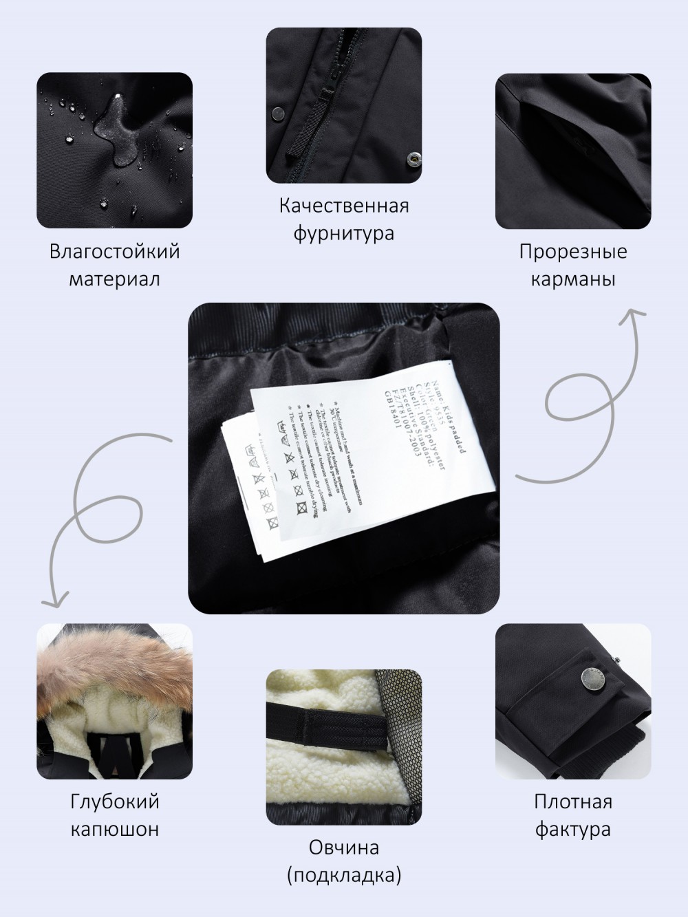 Вместительные внешние карманы с мягким начёсом на молнии и магнитах подходят для хранения мелочей и согревания рук, внутренние карманы позволяют носить телефон и документы. Светоотражающие элементы и логотип делают ребёнка заметным в тёмное время суток и повышают безопасность.