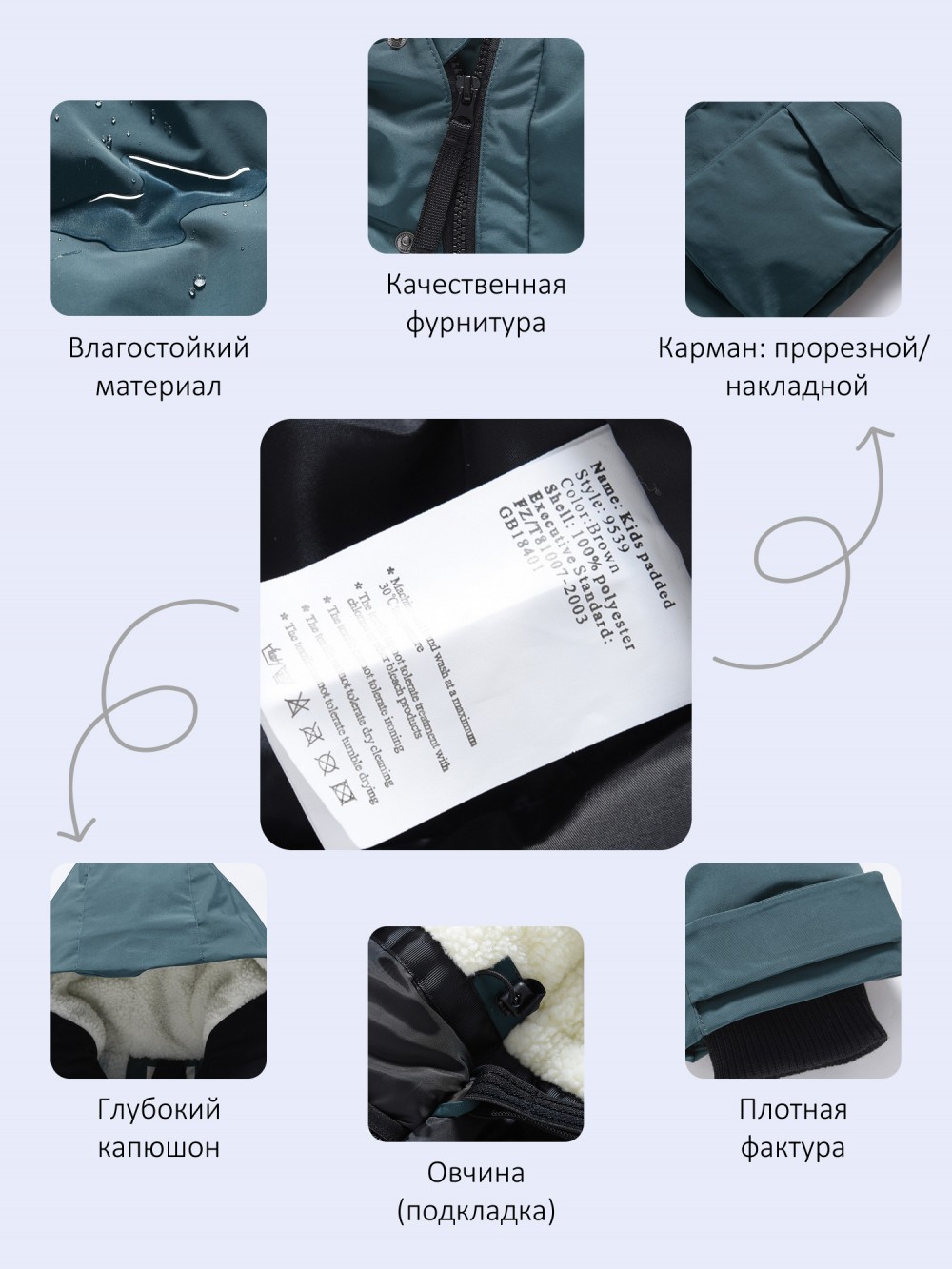 водоотталкивающий материал, гипоаллергенный материал, дышащий материал, с начесом, светоотражающие детали, с разрезом