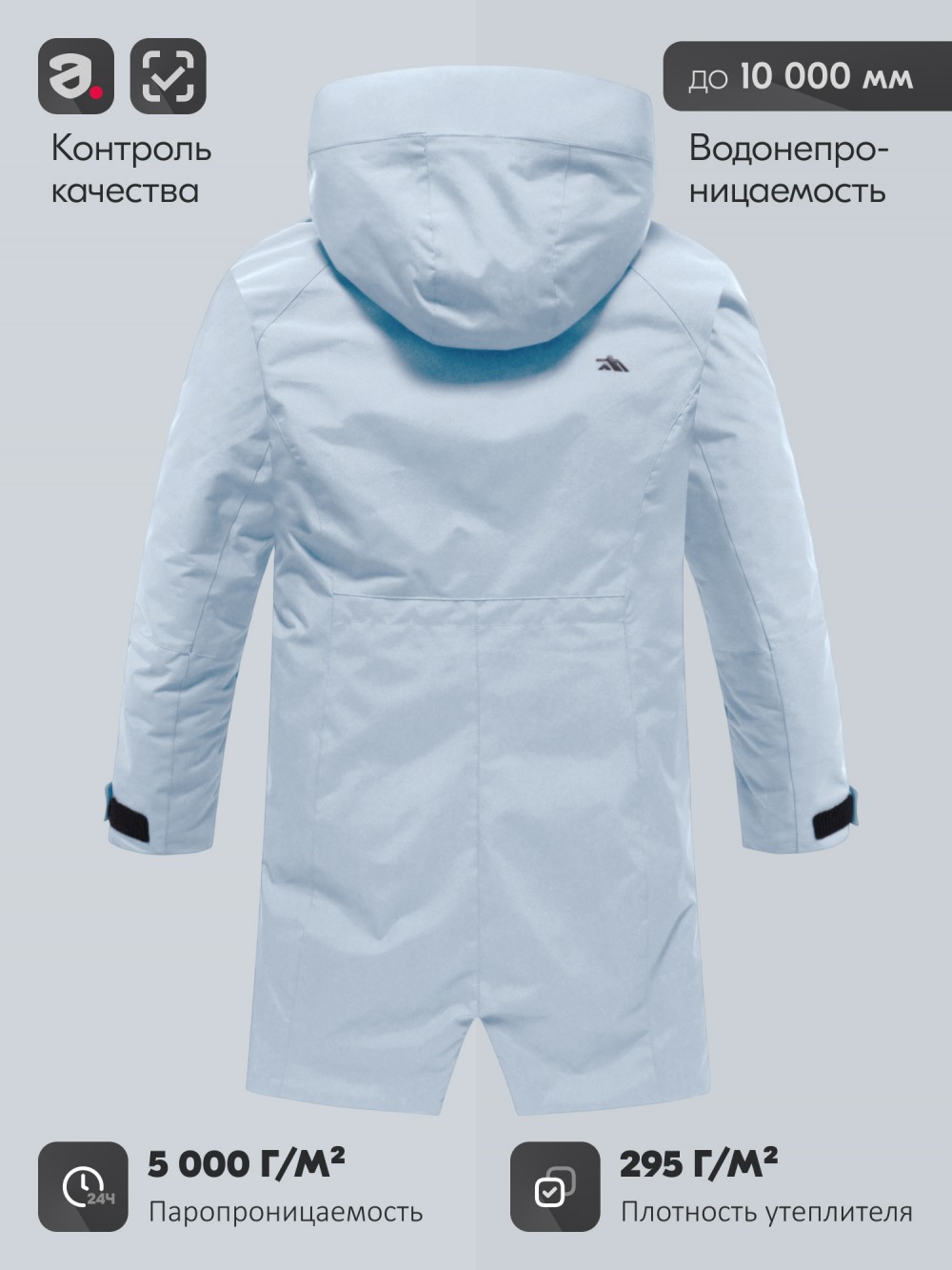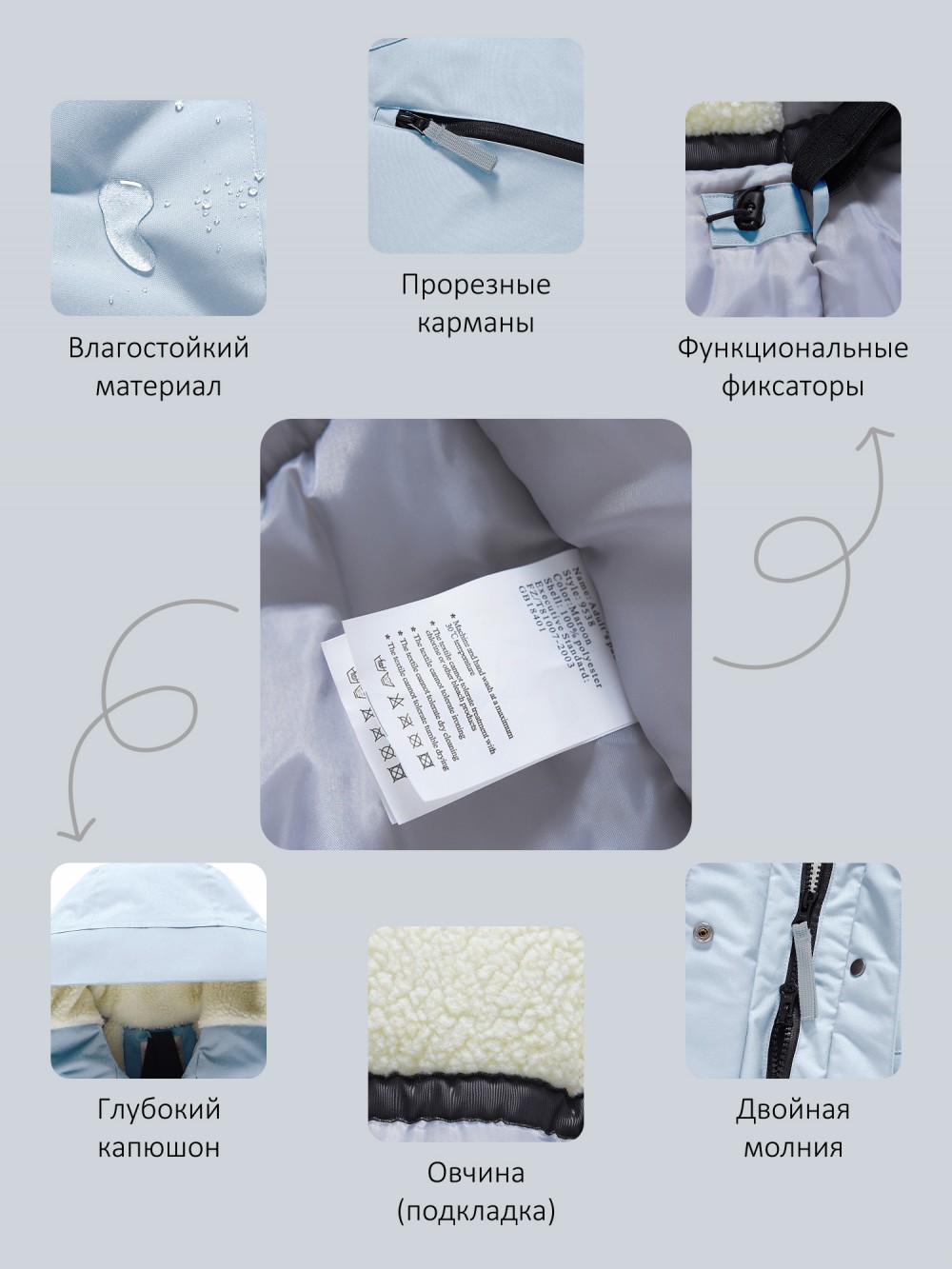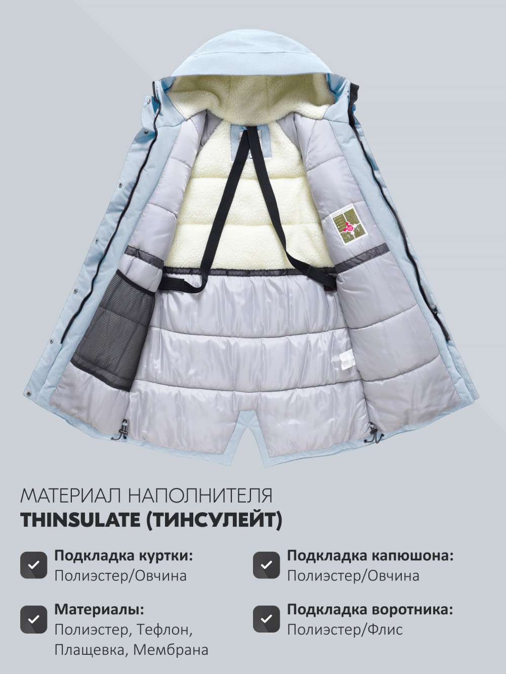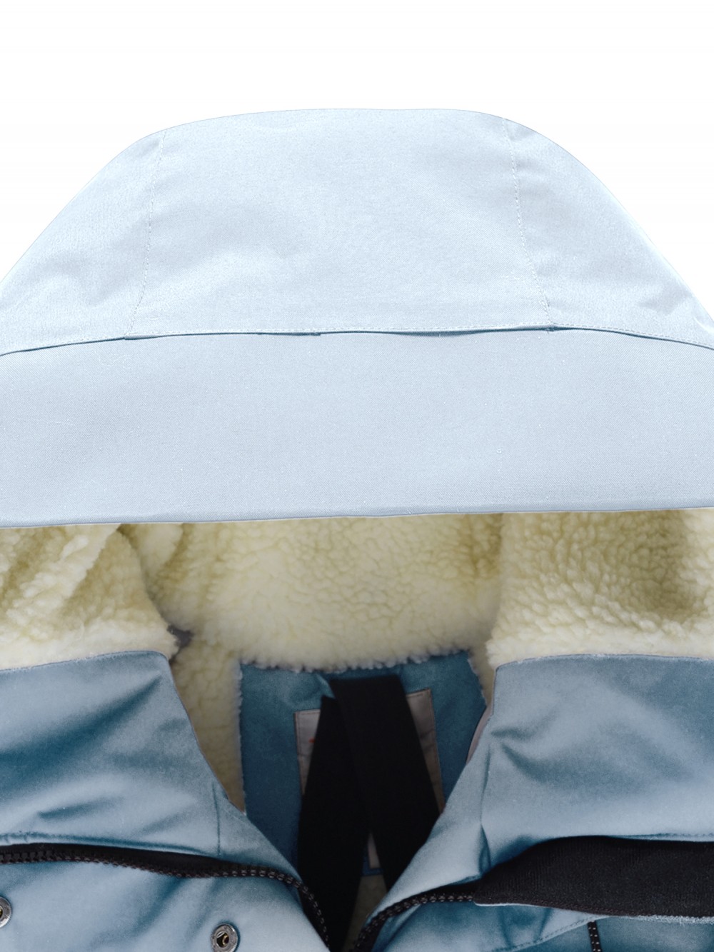 Внутренняя подкладка из овчины, полиэстера и флиса создаёт ощущение уюта и мягкого тепла. Несъёмный капюшон плотно прилегает, защищая голову от ветра и снега, а воротник-стойка надёжно закрывает шею. Регулируемые фиксаторы на рукавах, по низу и на капюшоне позволяют подстраивать посадку и сохранять тепло внутри.