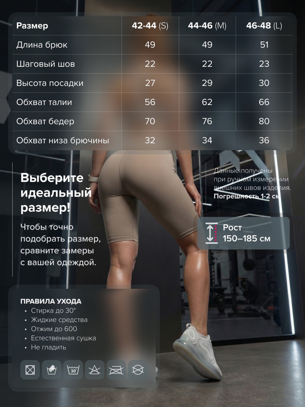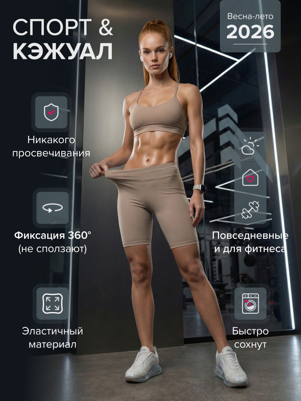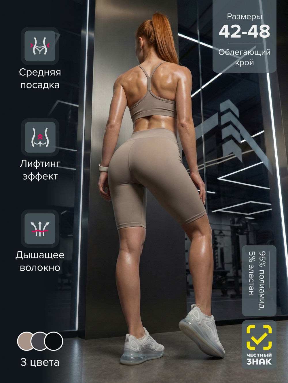 Плотный высокоэластичный материал обладает гладкой фактурой и эффектом легкой компрессии. Ткань не просвечивает, держит форму и сохраняет безупречный внешний вид после многократных стирок. Посадка остается стабильной во время тренировок, бега, силовых нагрузок и повседневной носки.