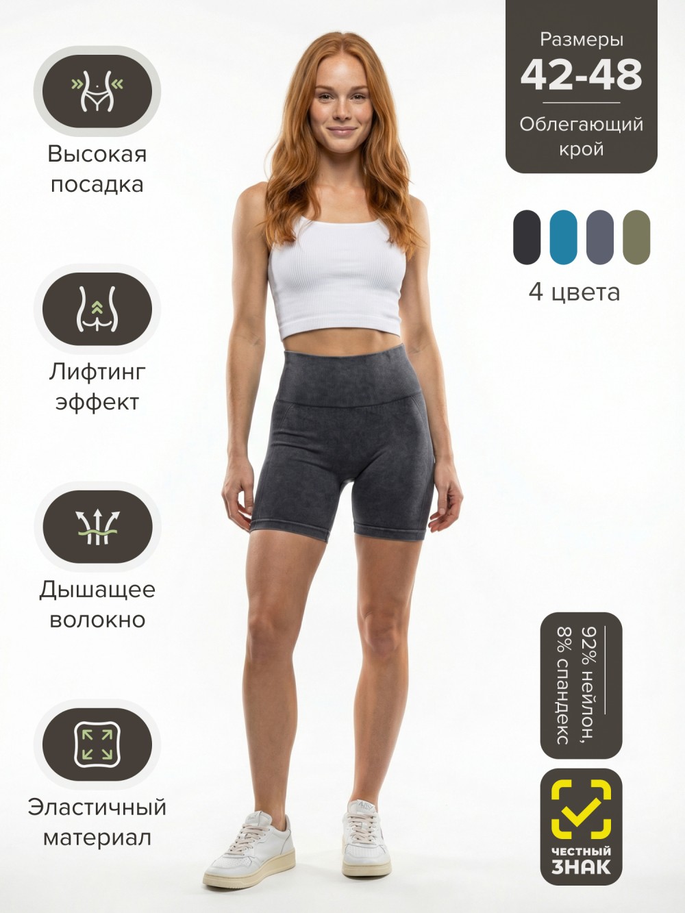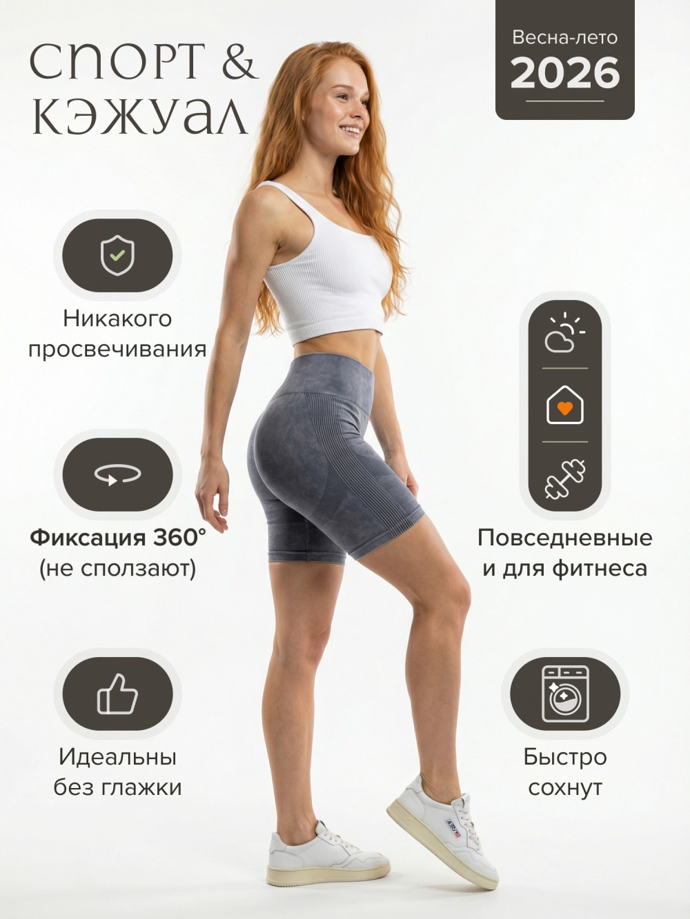 Модель подходит для спорта, фитнеса, йоги и повседневной носки. Легко сочетается с топами, футболками и спортивными комплектами.