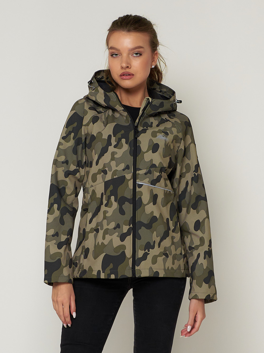 Ветровка софтшелл для женщин и девушек. Осенняя ветровка виндстоппер спортивного стиля оснащена прорезными боковыми карманами на молнии, несъемным капюшоном, рукавами реглан, скрытой ветрозащитной планкой и молнией. Капюшон имеет две утяжки на резинке с фиксатором. Слева, в области груди, имеется светоотражающий логотип бренда. Чуть ниже расположена светоотражающая полоска. Манжеты рукавов оснащены вшитой эластичной вставкой без утяжек. На спинке куртки Softshell находится прорез со светоотражающей полоской. На правом плече находится эмблема бренда. В нижней части куртки по бокам имеются фиксаторы для утяжки. Данная модель идеально подойдет для утренних и вечерних пробежек, прогулок по городу и на природе. Также в ней удобно кататься на велосипеде, самокате при поездках в городе на природе. Куртка с принтом камуфляж легкая и комфортная. Внутри флисовая и сетчатая подкладка. Ветровка windstopper- неотъемлемая вещь в гардеробе каждой девушки и женщины.